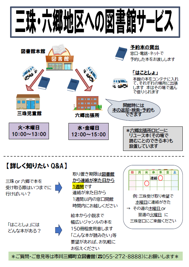 集約後も多くの皆様に本に触れあう機会を創出するために三珠地区・六郷地区で出張図書館サービス(はことしょ)をしております。 カレンダーは広報か公式Instaglamをご確認ください。