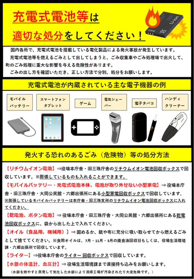 ホーム > 行政情報 > 生活環境課からのお知らせ > リチウムイオン電池などの危険物の回収について