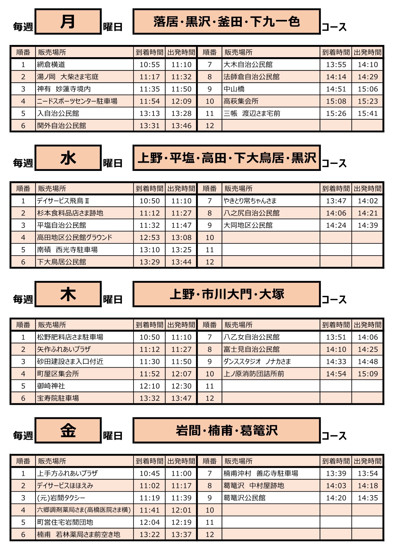 移動スーパーは、月曜日から金曜日にそれぞれのコースで運行します。※天候や道路状況により到着時間が前後する場合があります。(天候〈警報発令時〉、道路状況によっては運行できない場合もあります。)