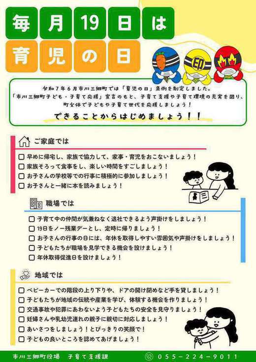 町では、町全体で子育て支援、子育て環境の充実を図り、子どもの健やかな成長を実現し、子どもや子育て世代を応援するため、毎月19日を「育児の日」と定めました。