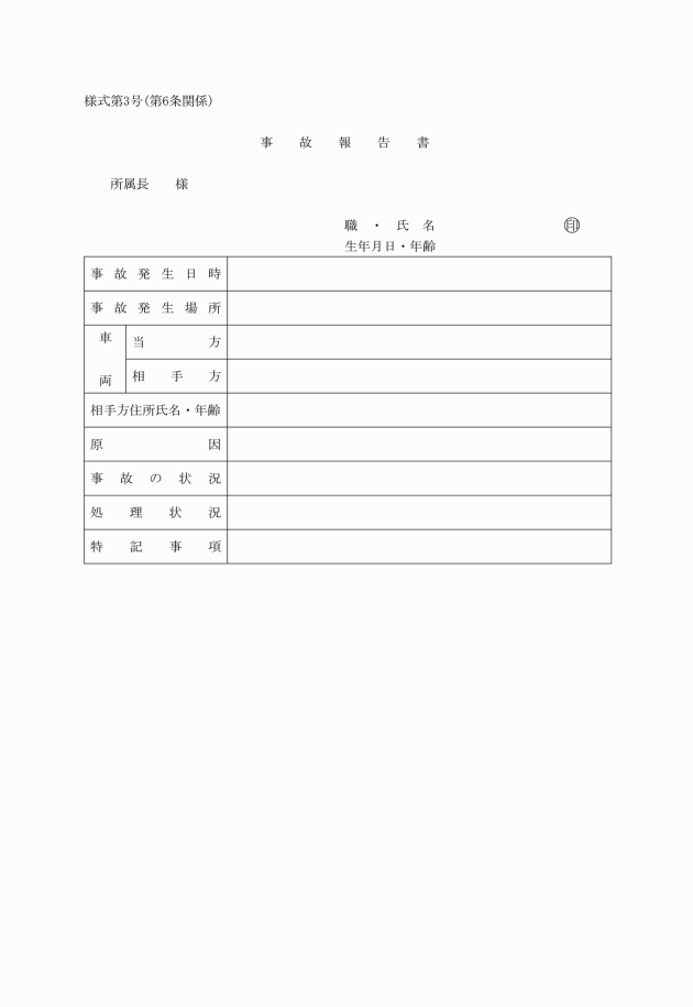 4 事故運転者は、事故発生後できるだけ、速やかに顛末書及び現場見取図を添えて交通事故の発生状況等を記載した事故報告書(様式第3号)を所属長に提出しなければならない。