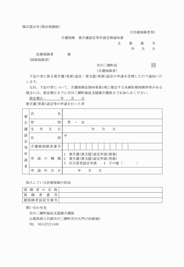 第20条 省令第110条第2項の規定による通知は、介護保険要介護認定等申請受理通知書(様式第16号)により行うものとする。