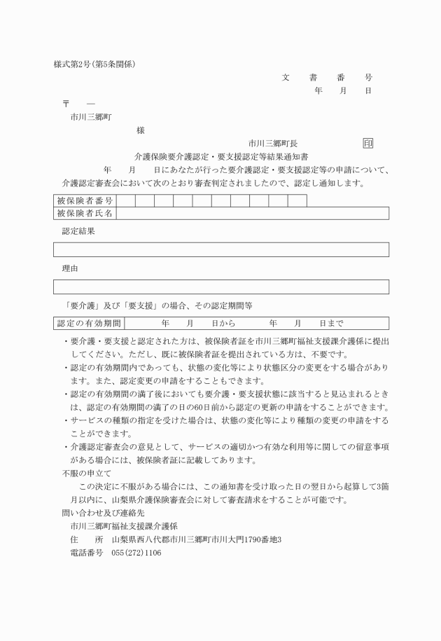 第5条 法第27条第10項前段(法第28条第4項において準用する場合を含む。)若しくは同条第12項(法第28条第4項において準用する場合を含む。)、第32条第6項前段(法第33条第4項において準用する場合を含む。)若しくは同条第8項(法第33条第4項において準用する場合を含む。)又は第35条第2項、第4項若しくは第6項の規定による通知は、介護保険要介護認定・要支援認定等結果通知書(様式第2号)により行うものとする。